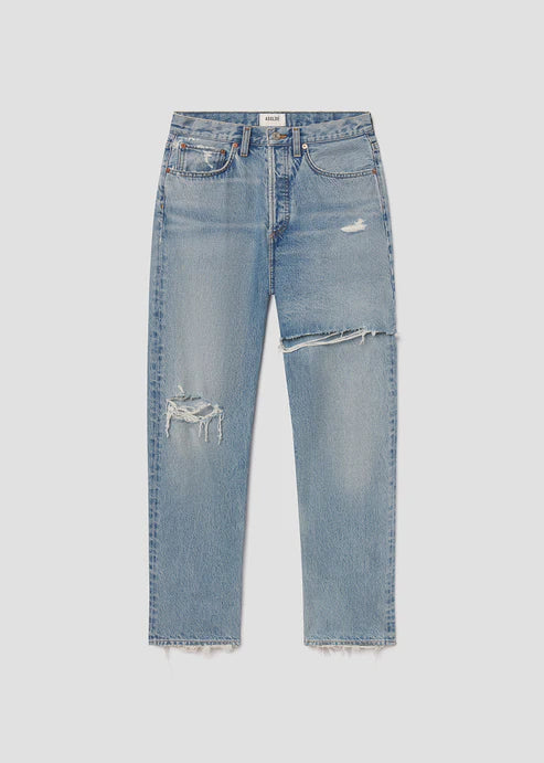 This authentic medium indigo jean features reworked destruction details for a raw, lived-in edge. Crafted from rigid regenerative cotton with a soft hand, the high-rise straight fit offers all-day comfort and a true-to-size silhouette. Style with a relaxed tee for an effortlessly cool look. Looks Like: Authentic medium indigo denim pant with reworked destruction detail
