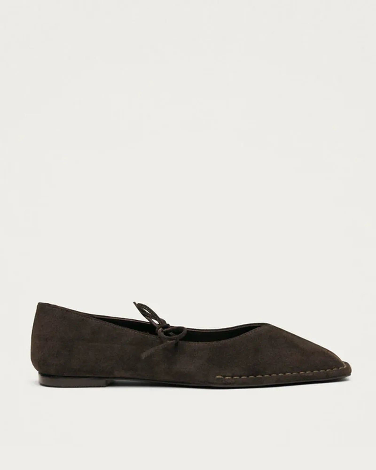 The Sway ballet flats reinterpret a timeless silhouette with understated sophistication. Crafted from velvety coffee brown suede, they feature a modern square toe and graceful V-shaped vamps, tied together with a delicate bow across the instep. This refined update brings quiet elegance to any look, a perfect balance of classic femininity and contemporary ease.