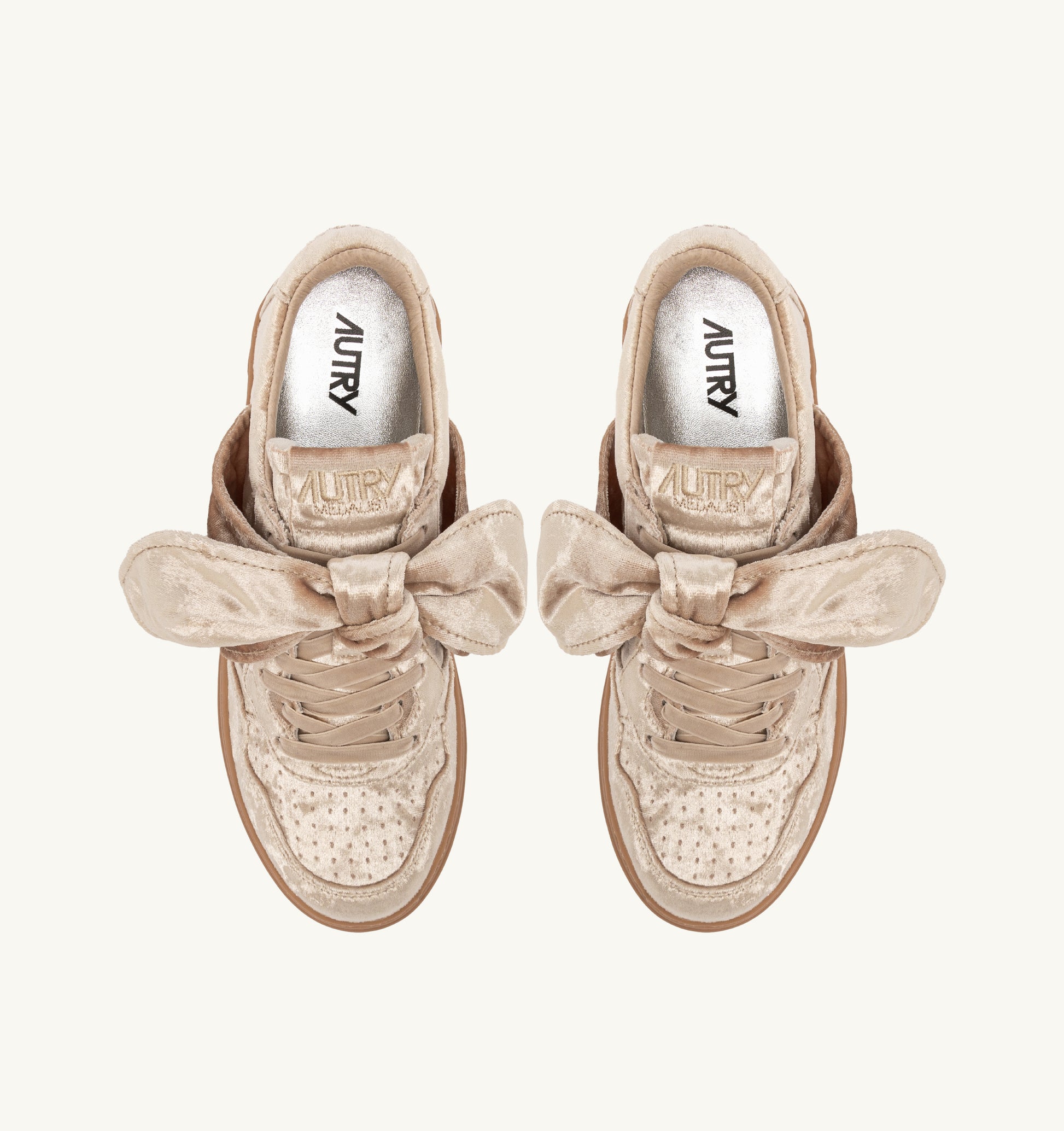 Autry presents Bloom — a capsule collection celebrating femininity in all its shades. The brand’s most iconic sneaker silhouettes are reinterpreted with refined craftsmanship and unexpected textures, from velvet to laminated leather, nubuck, and suede. Each design carries its own personality, defined by romantic floral embroidery, sparkling sequins, delicate crystals, bold micro-studs, or oversized bows. More than sneakers, they are statements of individuality — effortless expressions of modern femininity. This style features a rich velvet upper with matching flat velvet laces, an embroidered label on the tongue, and the signature jacquard logo. Finished with a padded collar, leather and cotton terry lining, a 2 cm raised leather sockliner, and a rubber sole (2.5–3.5 cm high). Comes with a personalized fabric shoe bag.