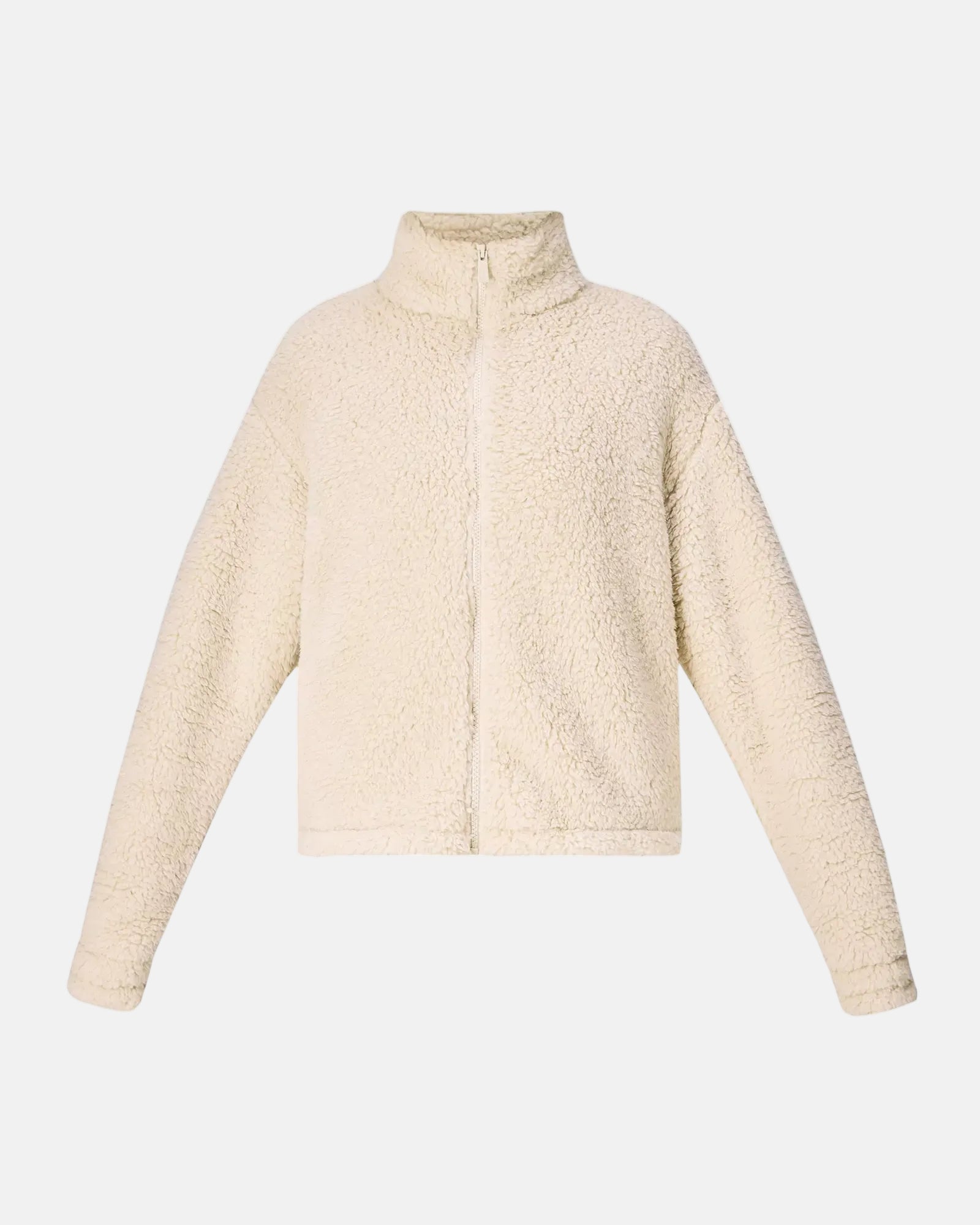 This sherpa fleece zip up features a funnel neck, adjustable details and side pockets, warm and practical for chilly days.