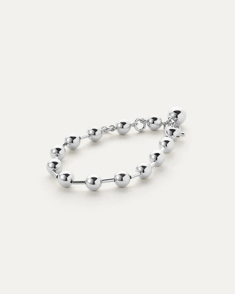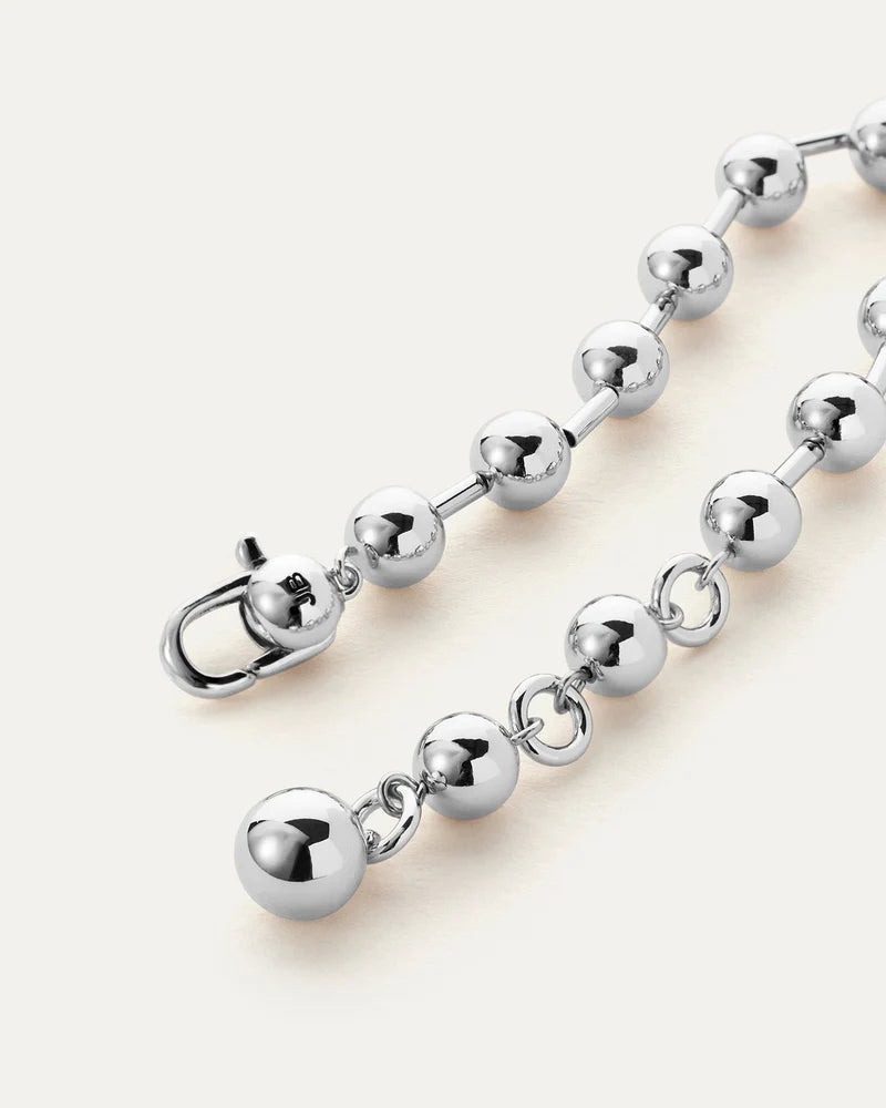 This bracelet features a strand of luminous metal spheres that reimagine the classic beaded style with a modern, sculptural twist. The stackable design includes three built-in extender rings, allowing it to be worn at different lengths for a custom fit. Finished in high polish silver, it adds a sleek shine to any look.