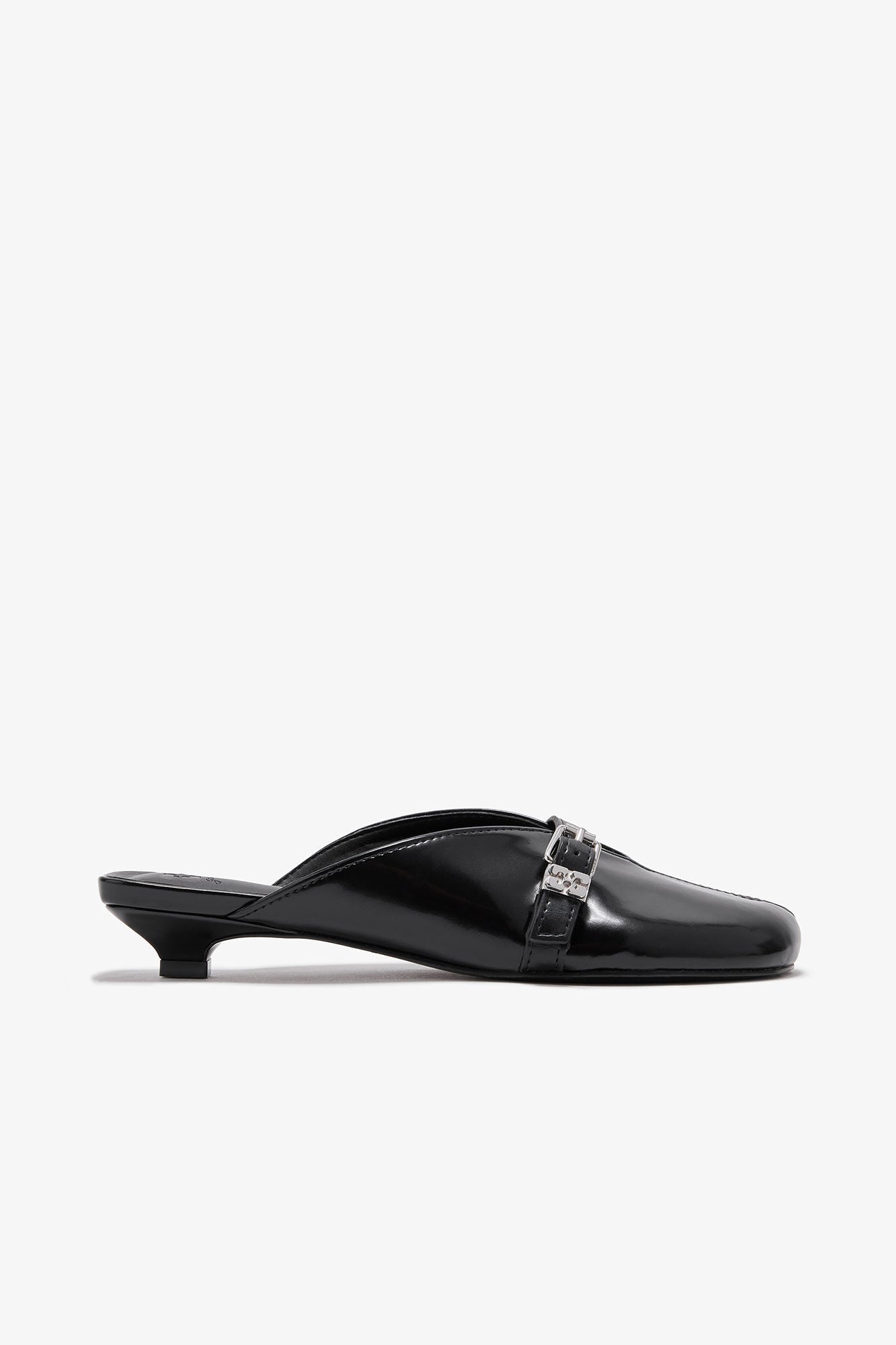 These heels feature a sleek mule-style design with a rounded toe and a distinctive V-shaped instep. A buckle strap with a silver-tone GANNI Butterfly logo adds a refined finishing touch. Crafted from 100% Oleatex™ — a conscious material made with 50% biobased polyurethane and 50% recycled polyester — they combine modern design with a more responsible approach to everyday style.