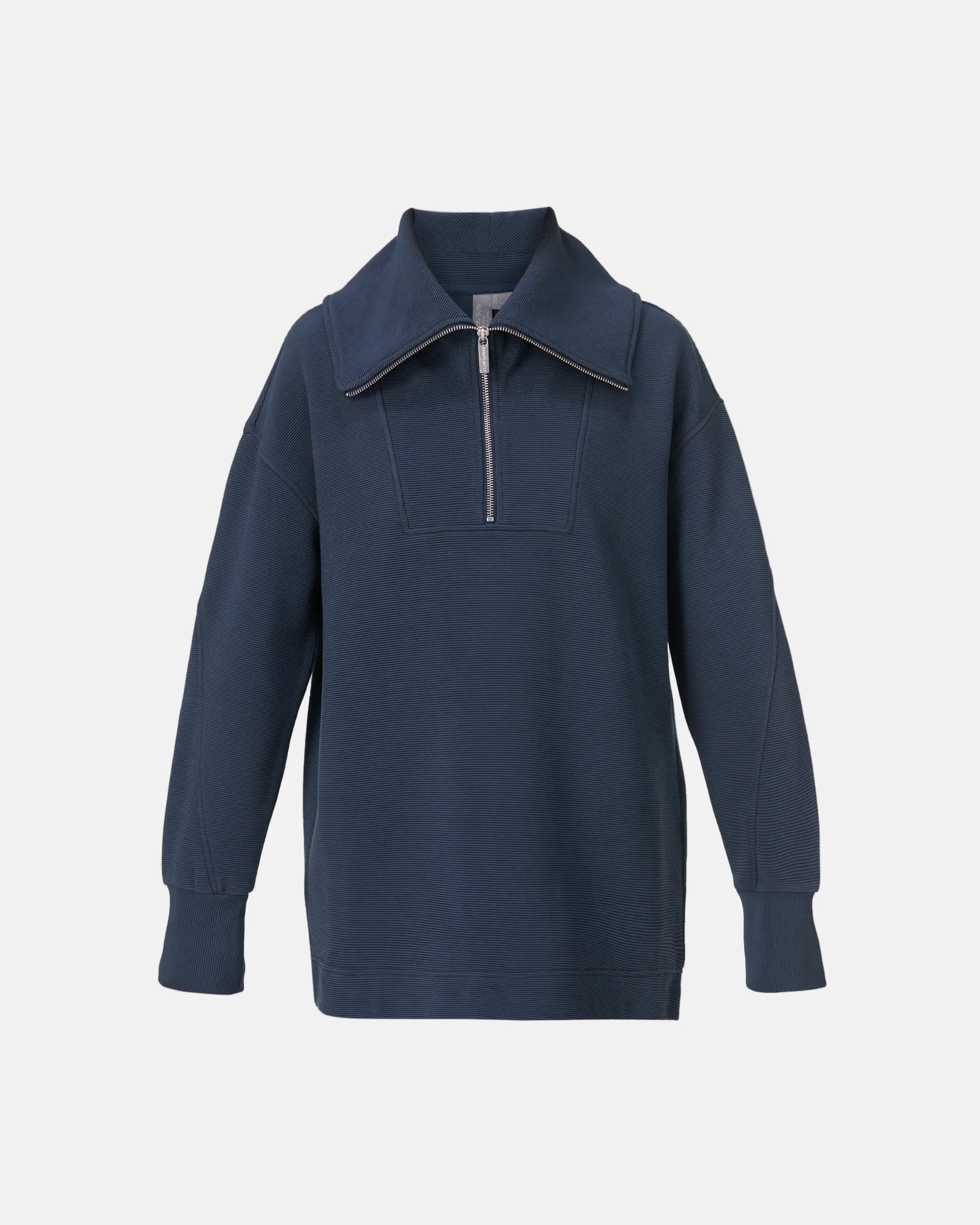This ribbed half zip knit moves from studio to street with ease, a relaxed shape with a loose hem and half zip gives casual polish, a small back logo adds a subtle sign off.