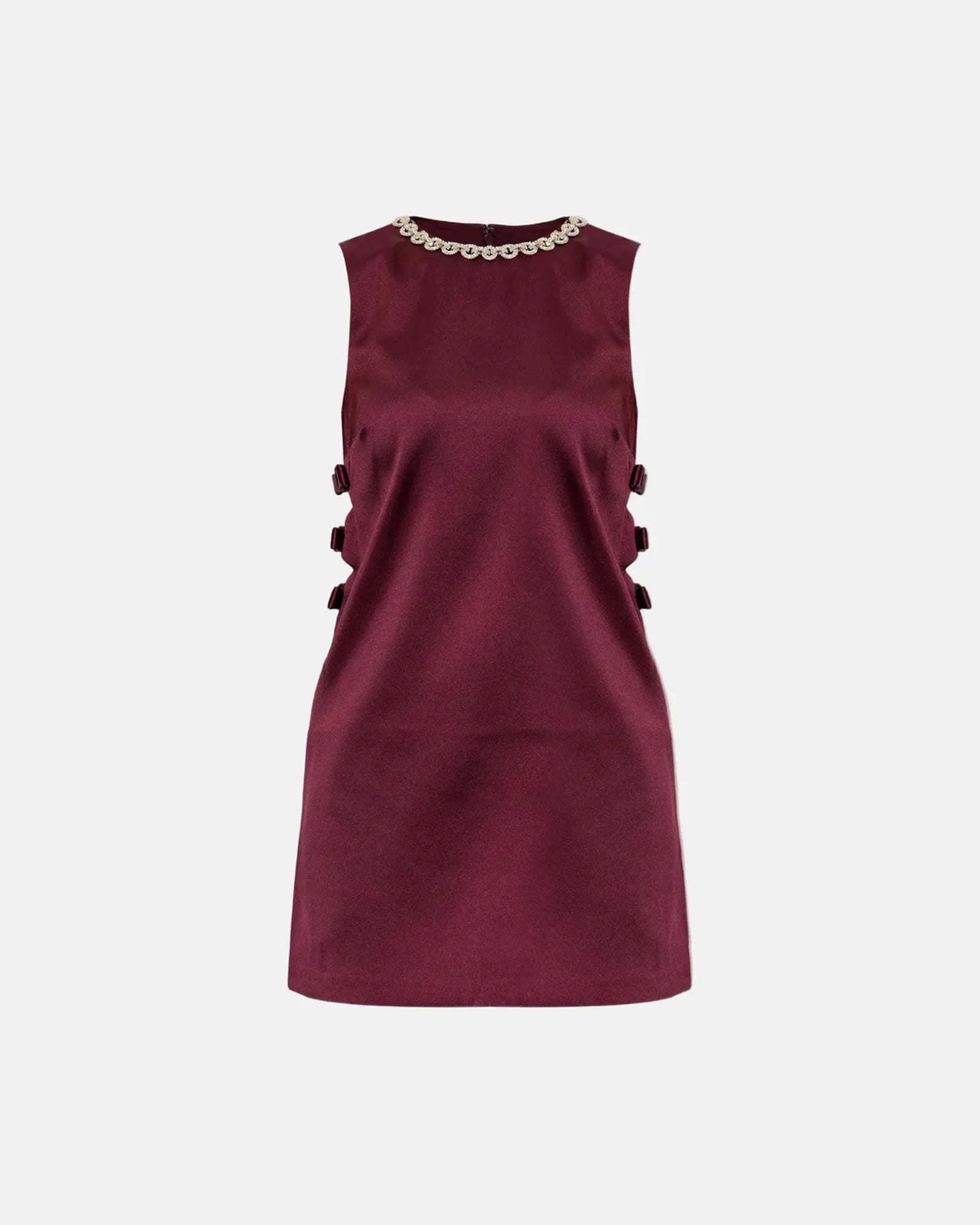 Revel in the luxurious texture of burgundy satin with this Mod-inspired mini dress, designed in a relaxed shift silhouette that’s both playful and chic. Sparkling crystal chain trim at the neckline lends a touch of glamour, while bow motifs draw attention to daring side cut-outs for a modern twist. True to size with a discreet side zip closure, it’s a versatile piece that pairs effortlessly with both flats and heels.