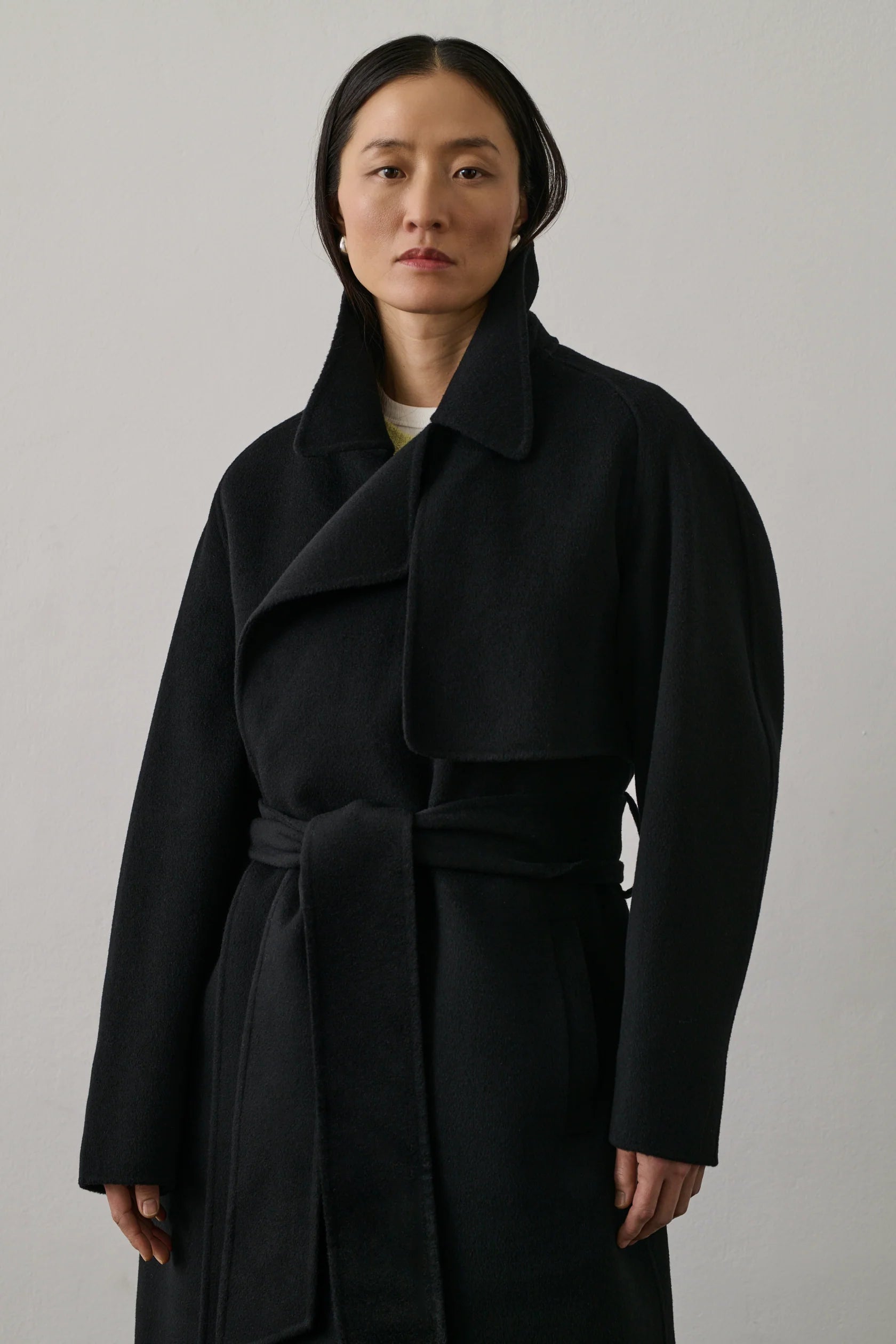 Sophisticated and timeless, this long black coat is crafted in luxurious cashmere and designed with a relaxed, loose fit for effortless elegance. The classic peacoat collar lends structure, while a removable belt allows you to define the waist or wear it open for a more laid-back silhouette. Finished with raglan sleeves and two piped side pockets, it combines refined tailoring with everyday ease — a versatile piece that elevates any wardrobe.