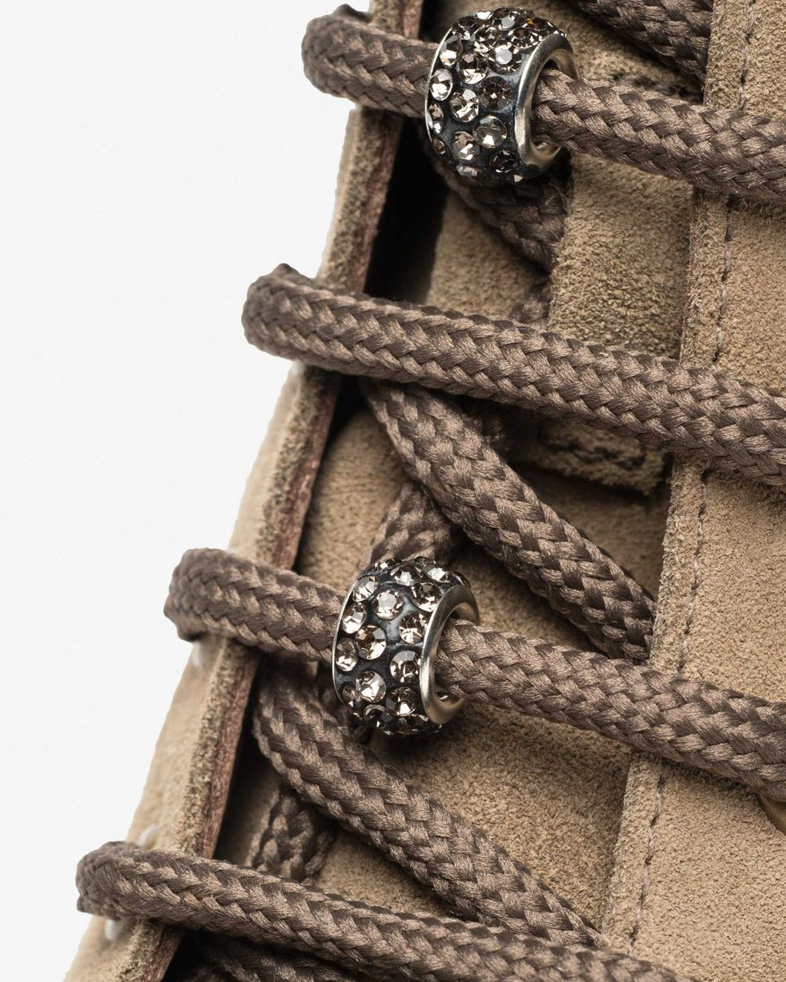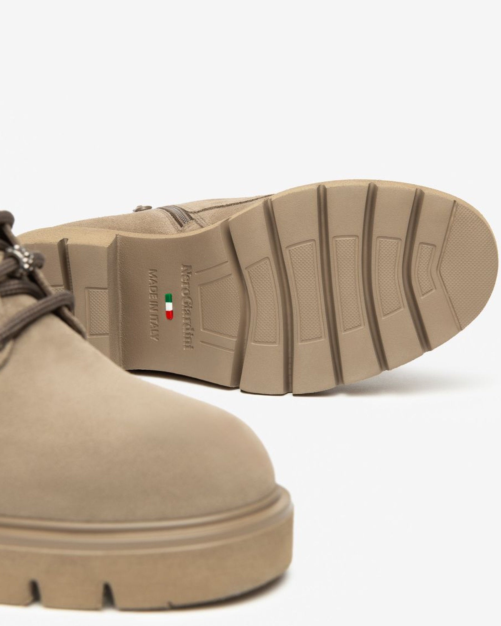 A taupe lace-up combat boot with soft suede texture, shaped on a treaded sole for city traction. The inside zip makes for quick on and off, the block heel brings a balanced lift. Wear with wide trousers or a sweater dress.
