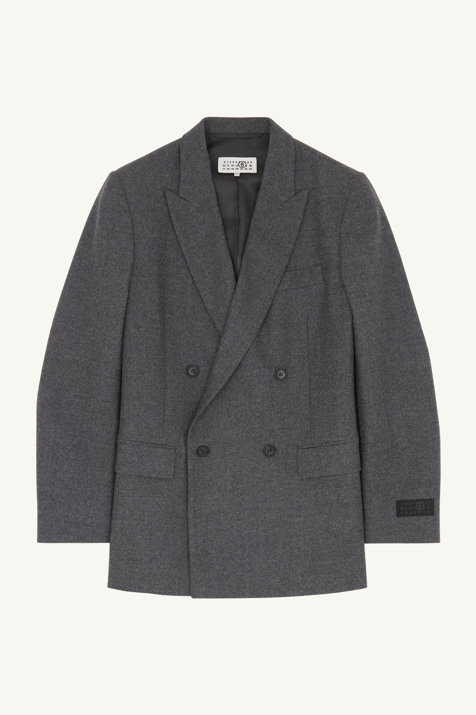 This double-breasted blazer is cut in structured virgin wool with peak lapels and flap pockets. The oversized shape is disrupted by subtle hallmarks, including a numeric patch stitched at the sleeve and the Maison’s white stitch line at the back. A refined yet quietly radical piece.